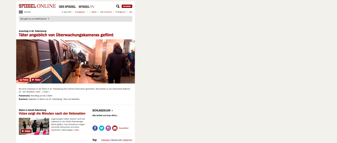 Wäre es nicht sinnvoller, das Missverhältnis von Layoutbreite und Bildschirmbreite ein bisschen besser zu kaschieren, indem man zumindest erstere zentriert darstellt? Das machen die meisten anderen Kandidaten. Mal etwas lustlos, wie die BUNTE, welche zusätzlich den dunklen Headerbalken einfach über die komplette Breite zieht: