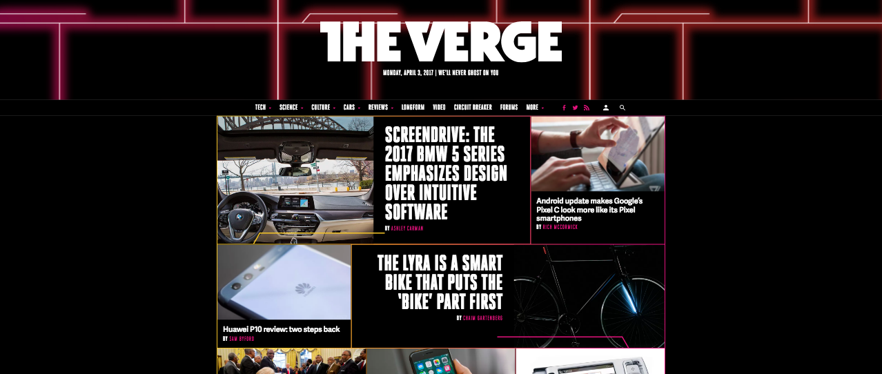 Oder etwas inspirierter, wie bei The Verge oder A List Apart, wo man mit interessanten Mustern oder typografischen Elementen versucht, den Weißraum außerhalb der Textspalte spannender zu inszenieren: