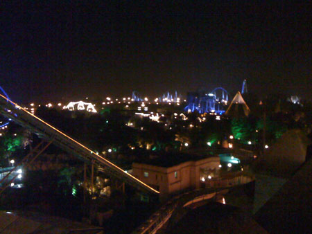Besonders beeindrucken konnten jedoch die Hotels. Mit soviel Liebe zum Detail, so netten Angestellten und so großartiger Atmosphäre habe ich selten übernachtet. Unbedingte Empfehlung, wenn ihr aus dem Freizeitparkbesuch eine stressfreie und gediegene Veranstaltung machen wollt. Man kann prinzipiell einen halben Tag damit verbringen, sich einfach nur alle Ecken, Gänge und Innenhöfe der Hotels anzusehen. Toller Ausblick auf den nächtlichen Park aus der Bar im 8. Stock des »Castillo Alcazar«: