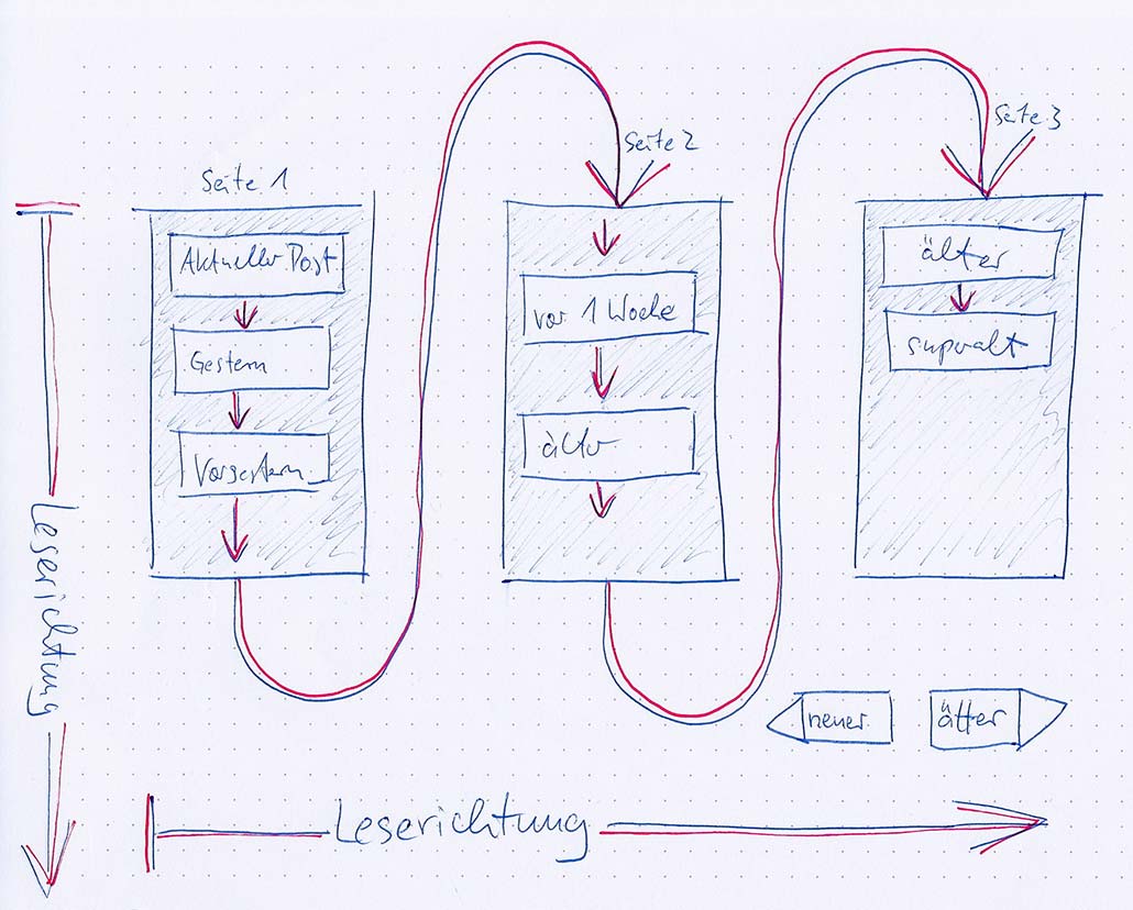 Immer noch nicht überzeugt? Dann erklärt mal, wie ihr euch die Sache mit einer detaillierteren Paginierung vorstellt. Jetzt kommt mir nicht damit, dass dies ein völlig anderer Kontext ist. Ist es nämlich nicht! Im user-centric design ist die Leserichtung entscheidend, nicht ein komischer Zeitstrahl. Diese Zeitstrahl verläuft nämlich auf Blogs und Newsbereichen primär mal von unten nach oben*, ist also eh schon falsch anders.