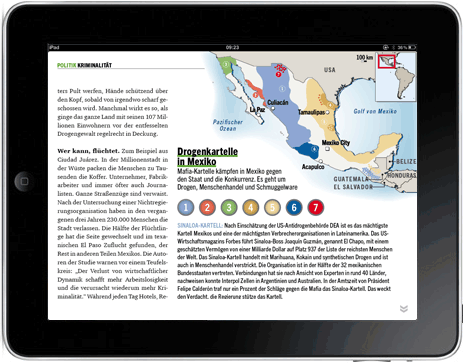 Des weiteren gibt es für meinen Geschmack zu häufig kleine Textkästen von vielleicht 400×400 Pixeln, in denen mehr Text steht als eigentlich hineinpasst, und in dem man dann swipenderweise herumfingern muss. Dieses kleinteilige Herumgescrolle ist schon ziemlich lange out und sollte meiner Meinung nach keine Rennaissance auf dem iPad erleben dürfen.
