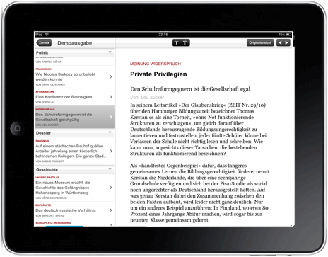 Insgesamt wirkt die ZEIT-App durchaus komfortabel und aus lesetypografischer Sicht gut gestaltet. Doch bei der Umsetzung der Print-Artikel muss noch einmal nachgearbeitet werden: Die krasse schwarz/weiß-Entscheidung zwischen totaler Textwüste und hübschem, aber unlesbaren Originallayout muss einem Kompromiss weichen. Entweder man erstellt ein eigenes, adaptiertes Layout für jeden einzelnen Artikel der iPad-Ausgabe (wie es WIRED macht), oder man erfindet einen Algorithmus, mit dem man zumindest die Fotos und Illustrationen aus dem Print-Layout irgendwie sinnvoll automatisch platzieren und nutzbar machen kann. Das wäre den hochwertigen Inhalten, die die ZEIT eigentlich immer noch zu bieten hat, durchaus angemessen. Und der direkte Hamburger Konkurrent DER SPIEGEL schafft das ja auch.