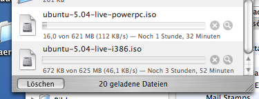 Nun lade ich mir erstmal aus reinem Spaß zwei Ubuntu-Live-CDs herunter. Einmal für meinen alten Windows-Rechner und einmal für mein Powerbook. Einfach nur so. Kostet ja nix, die 1,2 GB zu saugen. Herrlich.