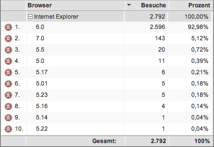 Um nochmal auf das Thema Internet Explorer zurückzukommen – Offenbar unterscheiden sich der IE 5.5 und der IE 5.0 kaum noch von Ihrer Nutzungshäufigkeit. Das überraschte mich. Aber die Zahlen von meiner Google Analytics Auswertung sprechen eine deutliche Sprache. Natürlich könnte man jetzt argumentieren, bla bla, die User auf praegnanz.de sind technisch versierter usw. Das glaube ich aber nicht – denn hier ist ja schon der Teil meiner Leser abgebildet, der nur über Google-Suche hineinstolpert. Keiner meiner regelmäßigen Leser verwendet den Explorer, in keiner Version. Davon kann man sicher ausgehen, oder?
