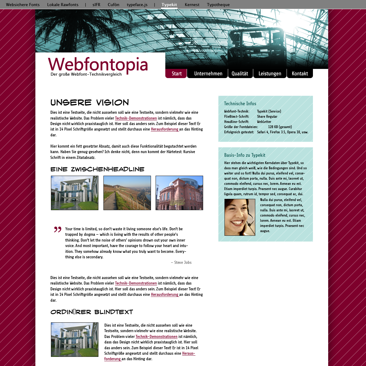 Mein eigentlicher Plan ist es ja, eine richtig realistisch anmutende Font-Testseite zu bauen, die nicht so gestellt und optimiert ist wie viele andere, sondern direkt aus dem Leben kommen könnte. Anhand dieser Testseite werde ich die diversen Font-Ersetzungs-Services gegeneinander vergleichen. Doch da ich derzeit keine Zeit für den Aufbau einer speziellen Demosite habe, muss mein Blog kurzfristig für das eine oder andere Fontface-Experiment herhalten.