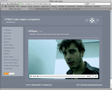 Dennoch können wir zufrieden sein: Derzeit versammeln sich 14 HTML5-Videoplayer (meist mit Flash-Fallback und JavaScript-Steuerungselementen) in unserer Liste, eventuell kommen noch zwei, drei weitere hinzu. Das bemerkenswert lustige Testvideo ist zum Glück nicht das tausendfach ausgelutschte Big Buck Bunny, sondern eine Realfilmproduktion, die es wesentlich einfacher macht, die Qualität des Codecs zu beurteilen.