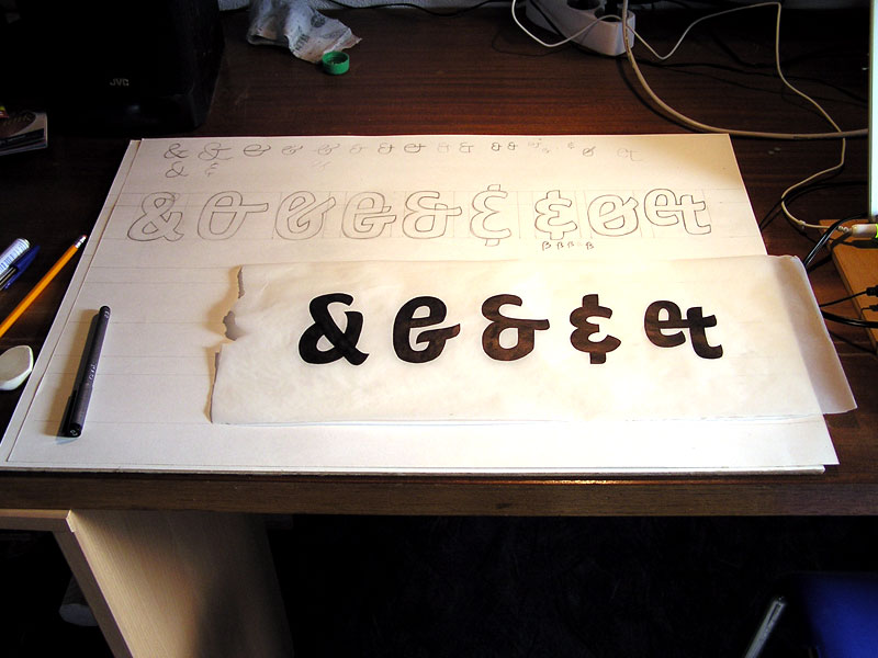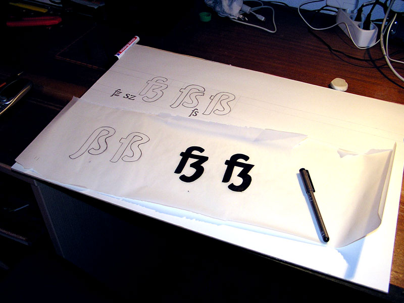 Immer mit Bleistiftskizzen. Wer sich gleich an den Rechner setzt und loskurvt, bei dem zeigen sich meist schnell grobe Fehler. Kein Computer kann Kurven so schön zeichnen wie die menschliche Hand und kein Buchstabe sieht am Bildschirm aus wie auf dem Papier. Aber ich zeichne nicht alles per Hand. Wenn das Gerüst steht, wird am Computer weitergemacht. Aber auch wenn ich mir mittendrin bei einem Buchstaben nicht mehr sicher bin, wird er erstmal wieder aufs Papier freigelassen, bis alle Zweifel beseitigt sind.
