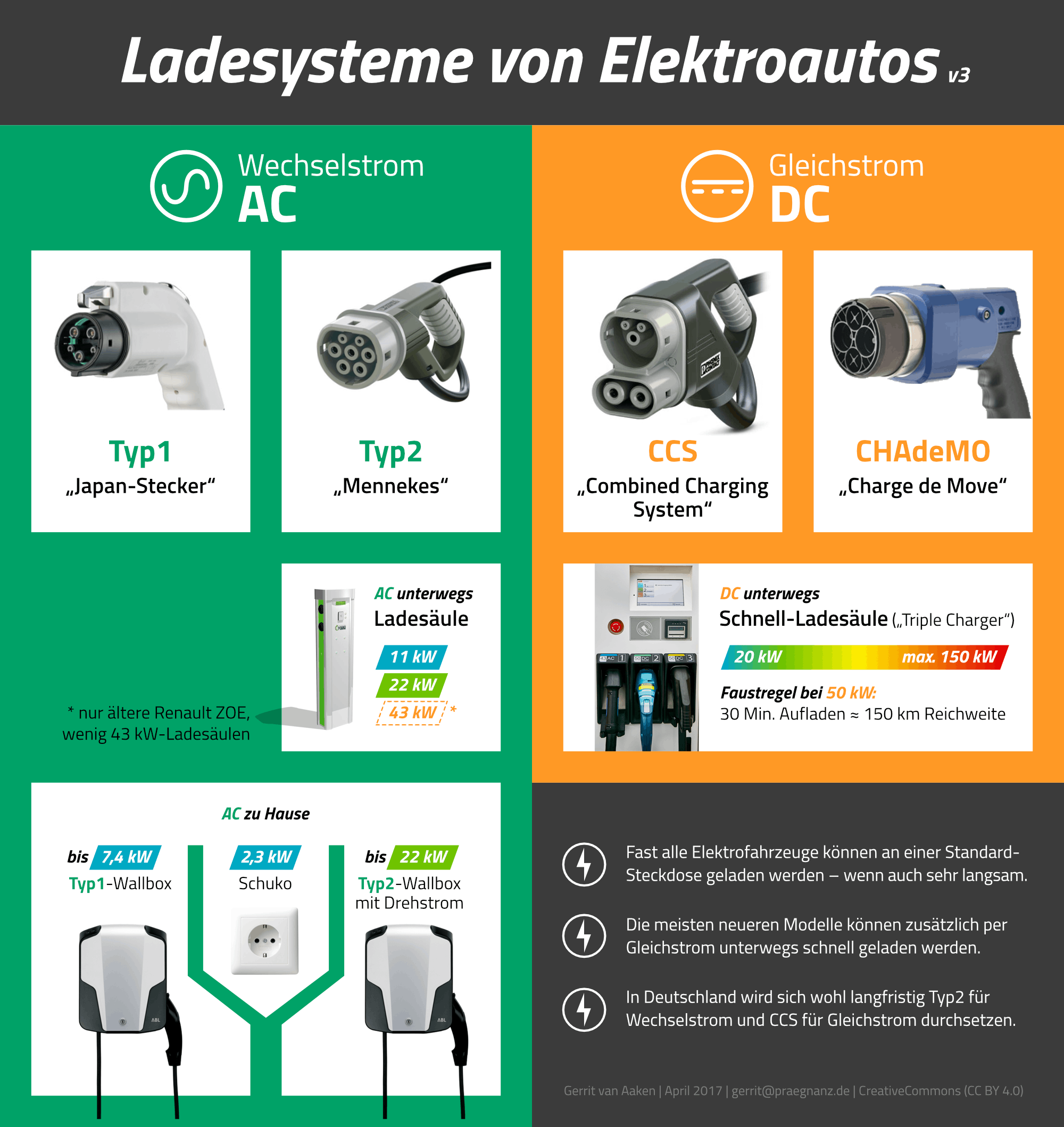 Ergänzend zu meinem 2016er Artikel über die Stecker- und Stromsituation bei Elektroautos habe ich nun eine kompakte Grafik gebastelt, die das ganze noch ein wenig besser verdeutlicht:
