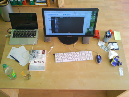 So sieht das aktuell aus in der praegnanten Ecke im P8. Ja, der MacBook-Monitor ist aus – ich brauche nur einen zentralen Schirm. Der ist aktuell von Samsung und halbwegs okay, wenn auch nicht brillant. Zum Nachschlagen das exzellente Buch von Peter Kröner, zum Hören die Boxen von Bose, Subway-Sammelmarken, iPhone-Notizblöcke, Lorano und eine billige 10-Euro-Maus.
