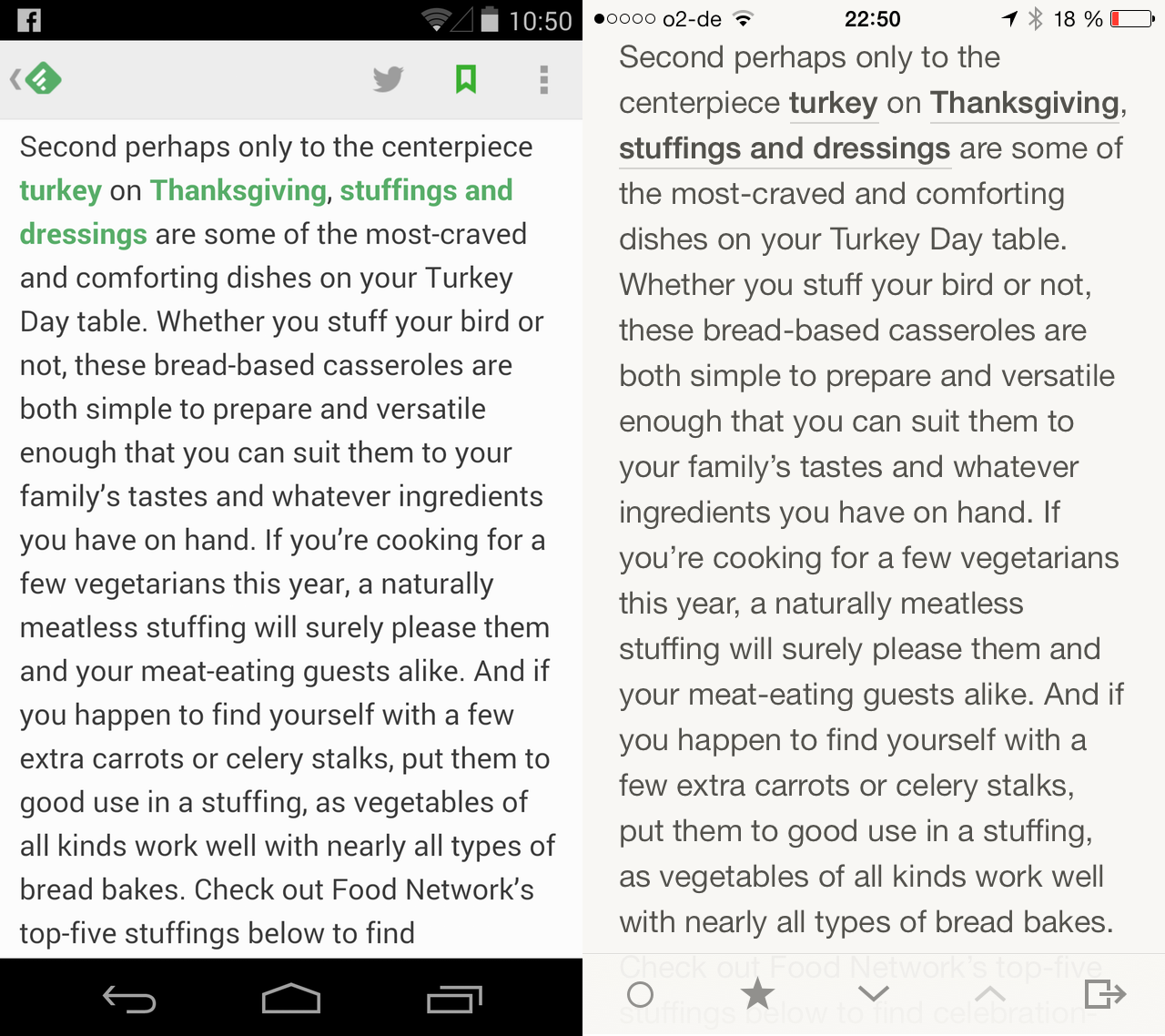 Gerade im Gegenzug zur extremen Typolastigkeit Helveticalastigkeit von iOS 7 ist das Nexus-Android wohltuend differenziert in seinem Grafikdesign. Auch wenn die verwendete Systemschrift Roboto nicht alle Designpreise der nächsten Jahre gewinnen wird, sie ist in Fließtexten deutlich angenehmer zu lesen als die Helvetica-Wüste. Hier ein Vergleich (Feedly-App vs. Reeder 2):