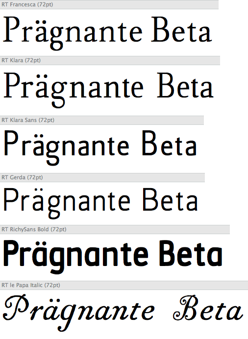Was nicht heißen soll, dass man nicht auch Lauftexte damit setzen könnte! Die einzige Schrift, die es schon fertig zu Kaufen gibt, ist die RT Francesca. Bestellung läuft alles in Eigenregie über die Website, demenstprechend günstig ist der Preis: 50 Euro für vier Schnitte und einige Open-Type-Features wie alternative Zeichen usw. Und man darf durchaus davon ausgehen, dass noch weiter an daran gefeilt wird. Neben der Francesca warten allerdings auch noch mindestens 4 weitere Schriftentwürfe darauf, für den Verkauf komplettiert und veredelt zu werden. Gerade was den Rhythmus des Grauwerts angeht, kann da noch ein wenig was gemacht werden!