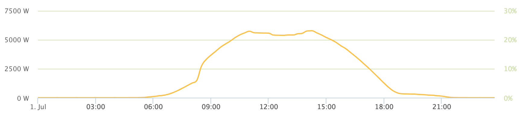 Im Juli habe ich bisher durchschnittlich 35 kWh Sonnenenergie pro Tag geerntet. Zunächst wird mit dem Strom natürlich die Hausbatterie vollgemacht, welche 7 kWh Kapazität hat. Wenn diese voll ist, wird der Reststrom ins Netz eingespeist. Sobald es dunkel wird, wird der Spaß umgedreht – die Batterie versorgt das Haus solange mit Strom, bis sie leer ist, und dann beziehe ich den noch notwendigen Strom aus dem Netz. Ein typischer Zyklus sieht also im Hochsommer so aus: