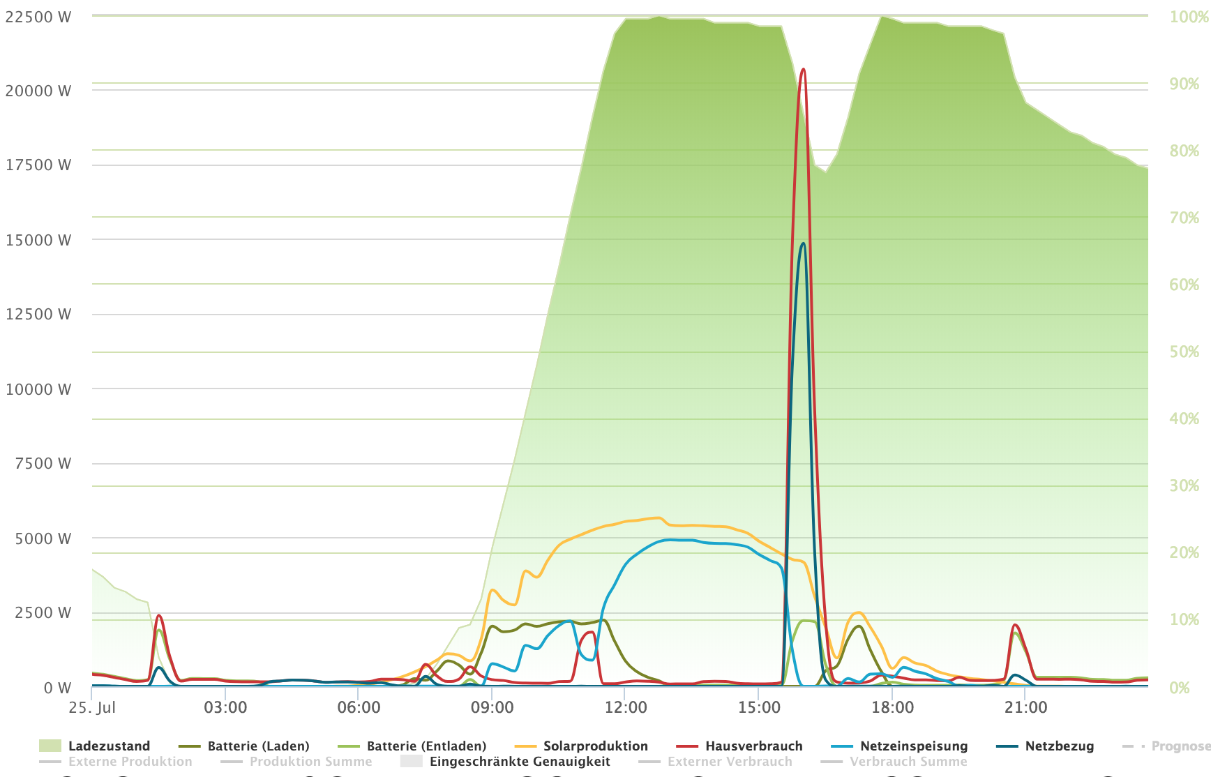 Ach ja, für die Nachkriegsgeneration ist ja die Autarkie so wahnsinnig wichtig. Für mich eigentlich nicht, aber sei’s drum: Mir wurde ein Autarkiegrad von irgendwie 50 % errechnet. Das heißt allerdings im Wesentlichen, dass ich im trüben Herbst und Winter mit ständig laufender Heizung beinahe den gesamten Strom aus dem Netz beziehen werde (wie bisher auch), und im knalligen Sommer wie aktuell leicht auf 98 % Autarkie komme (ausgenommen an Tagen, wo ich den Wagen auflade). Insgesamt kein wichtiger Punkt für mich. Echte Autarkie hat man meines Erachtens nur mit wesentlich (wesentlich!) größeren Strom- oder Wärmespeichern, oder halt mit Dieselgeneratoren. Aber wo bekommt man den Diesel her? Eine andere Geschichte, fürchte ich.