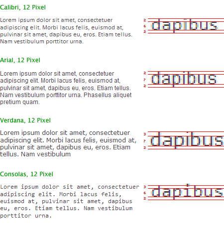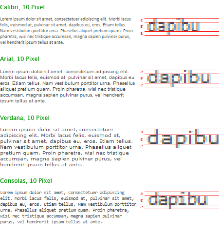 Diesmal noch eindeutiger: Calibri und Consolas haben nur eine x-Höhe von 6 Pixeln, während Arial und Verdana 7 zu bieten haben. Die Verdana gönnt sich darüber hinaus wieder volle 3 Pixel für die Oberlänge und füllt mit 12 Pixel Gesamthöhe den kompletten virtuellen Kegel aus, was an sich ungünstig ist, aus diversen Gründen. Die Consolas indes macht sich nach oben hin frei und setzt ausschließlich für den i-Punkt eine Extra-Pixelreihe an.