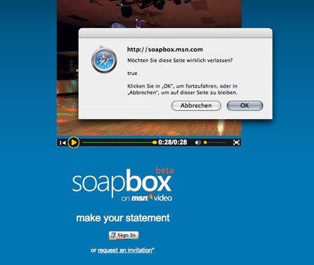 Sowas will ich in Zukunft af keiner einzigen Internetseite der Welt mehr erblicken. Nach der Bestätigung mit OK ist übrigens prompt mein Browser abgestürzt. Microsoft rächt sich. Ich räche zurück: Nie mehr werde ich den neuen Videodienst zu benutzen versuchen.