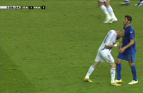 Die spannende Frage: Welcher Fotograf hat Zidanes Kopfstoß gut im Bild erwischt? Der Mann könnte jetzt reich werden, denn das dürfte das mit Abstand meistgefragte und daher teuerste Foto dieser WM sein. Auf dem Platz hat man die Tätlichkeit ja offenbar kaum bemerkt, im TV war es jedoch deutlich zu sehen. Aber solche Screengrabbings sind ja meist von zweifelhafter Qualität. Andererseits wurde ja diesmal alles in HDTV produziert. Interessant dürfte es allemal sein: Achtet mal drauf, wer das Bild wann und wie veröffentlicht :-) Spiegel Online hat’s noch nicht drin …