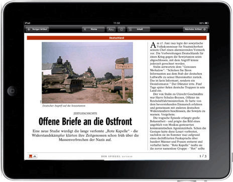 Inhaltlich handelt es sich um eine unveränderte Version des gedruckten Heftes (allerdings ohne Werbung) – mit Spiegel Online hat das nicht viel zu tun, außer, dass bei einigen Artikeln Querverweise zu Diskussionen im Spiegel-Online-Forum angebracht sind, was einen ziemlich cleveren Medienlink herstellt. Das Layout der Spiegel-App wird automatisch (wahrscheinlich clientseitig erstellt), was übrigens der größte Kritikpunkt im Fontblog-Bericht ist. Ich selber halte es nicht für verwerflich, ein umfangreiches Wochenmagazin wie es der Spiegel ist, auf dem iPad automatisiert darzustellen. Das Magazin ist sowieso sehr textlastig und auch das Heft strotzt ja nicht gerade für aufwendig gestalteten Doppelseitenkompositionen – das ist ja gerade das Markenzeichen der Hamburger. Insofern ist es gut, dass der Leser sich auf dem iPad das Leseformat so einrichten kann, wie er möchte: Querformat mit drei Spalten, Hochformat mit zwei Spalten, je zwei Schriftgrade zur Auswahl. Insgesamt also vier Möglichkeiten, wie die Seiten aussehen können – vielleicht ein bisschen zu unflexibel, wenn man es mit den Möglichkeiten einer Website vergleicht, aber ein okayer Start.