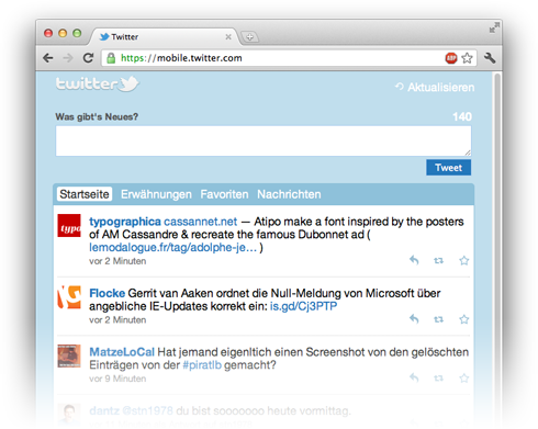 Aus meiner Sicht gibt es eine neue technische Referenz in Sachen »Mobile Web-App«, und die heißt Twitter. Ich hatte ja vor einigen Monaten schon Spiegel Online gelobt für ihre beispielhaft schlanke und gut bedienbare mobile Website. Im Bereich der Web-Applikationen sitzt nun Twitter auf dem Thron. Hier ein paar Gründe und Beobachtungen: