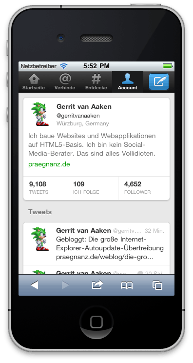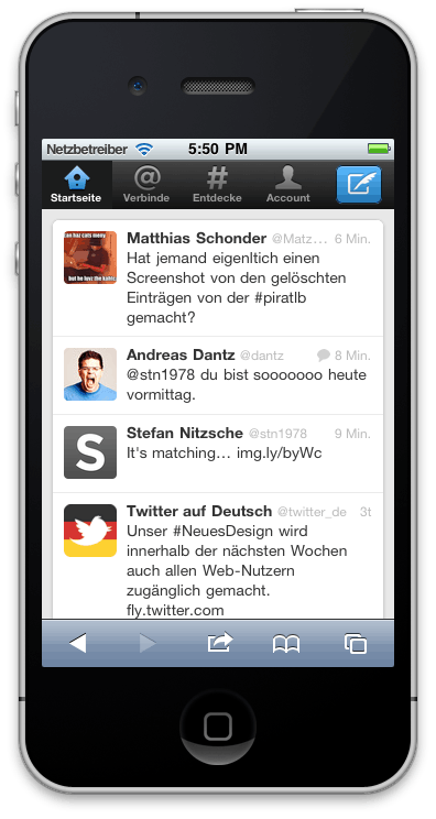 Die zweite entscheidende Frage: Mache ich beim Hinzufügen zum Home-Screen eine »abgeschlossene App« draus, werde dadurch Adressleiste und Footerleiste los und nehme dafür in Kauf, dass Hyperlinks nach draußen einen Sprung zu MobileSafari verursachen, wie in meinem Artikel neulich bemängelt? Twitter hat sich dagegen entschieden: Die Adresszeile wird durch intelligentes Anspringen von Ankern Koordinaten pixelgenau versteckt, und die hässliche hellblaue Fußleiste wird schlicht in Kauf genommen und für Vor- und Zurück-Operationen genutzt.