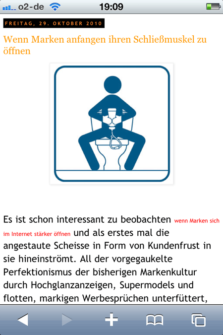 Doch die Verkleinerung der Website ist nicht ganz so akkurat: Manche Textabschnitte werden eigenmächtig deutlich vergrößert und haben nur noch wenig mit dem Schriftgrad zu tun, der ihnen nach den allgemein gültigen CSS-Regeln zustünde. Mobile Safari macht das, weil es für uns sorgt! Das Ziel ist es, den Hauptfließtext einer Website als solchen zu identifizieren und – unter den widrigen Umständen eines kleinen Displays – besser lesbar darzustellen, während man andere Elemente lieber im Original-Layout belässt, damit nicht das gesamte Seitenlayout gesprengt wird.