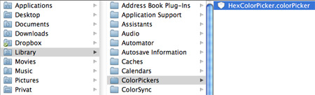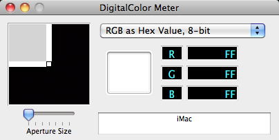 Ein kleines und nützliches Boardmittel von MacOS X, welches unter Programme/Dienstleistungsprogramme bereitsteht. Der Farbmesser kann so eingestellt werden, dass er immer den Hex-Farbwert anzeigt, der sich an der Mausspitze gerade befindet. Über das Tastaturkürzel ⇧⌘C wird dieser dann in die Zwischenablage kopiert.
