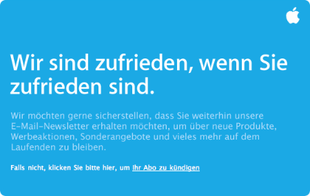 Das nenne ich mal E-Mail-Marketing, das sympathisch daherkommt und gleichzeitig die Datenbank des Unternehmens sauber hält: Apple hat mir gestern eine E-Mail geschickt. Inhalt war lediglich der freundliche Hinweis darauf, dass ich jederzeit die Möglichkeit habe, den Newsletter zu kündigen, wenn ich mag. Darunter ein Link zum Abbestellen.