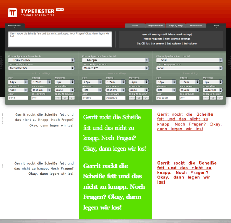 Passend zum Thema gibt es nun mit Typetester ein sehr gut durchdachtes und extrem praktisches Tool zum Gucken, Spielen und Vergleichen von Webtypografie! Man kann alles einstellen, was CSS so an Schriftmanipulation hergibt und sofort das Ergebnis betrachten. Toll zum Experimentieren und Planen. Eine unbedingte Empfehlung!