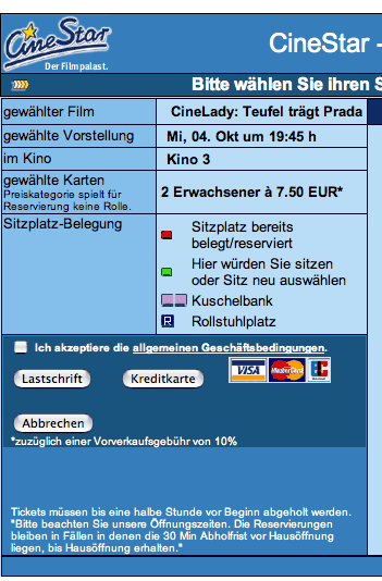 Wie gesagt, so könnte man es machen. Cinestar hat sich jedoch für den nutzerfeindlichen Weg entschieden! Man verliert kein Wort darüber, dass man nicht reservieren kann, sondern lässt einfach in der entscheidenden Maske den entsprechenden Button weg! Der ahnungslose, reservierungswillige Kinokunde stößt somit unweigerlich auf zwei weitere, geheimnisvolle Buttons namens »Lastschrift« / »Kreditkarte«. Und wenn man bis dahin immer davon ausgegangen ist, dies wäre die Reservierungsmaske, drückt man da auch schon mal drauf und gibt seine Daten ein. Eventuell benötigt man die Kreditkarte ja zur Sicherheit, was weiß man denn schon genaues?